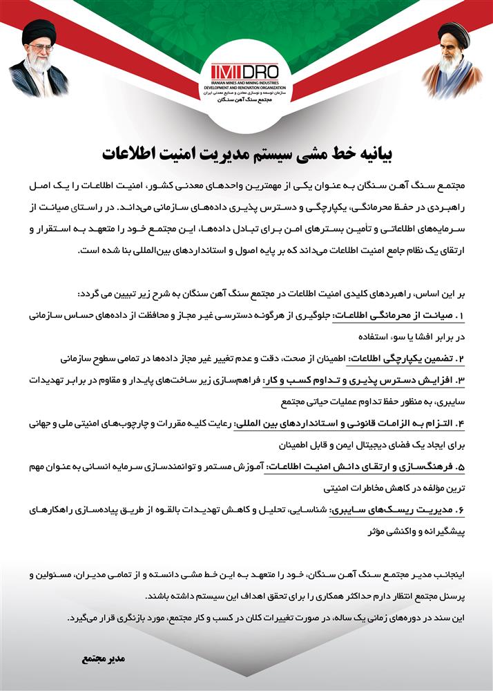 بیانیه خط مشی سیستم مدیریت امنیت اطلاعات مجتمع سنگ آهن سنگان